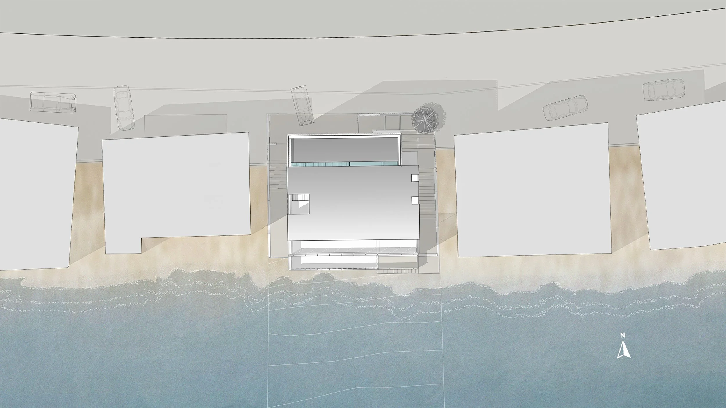 Perched above the ocean along Malibu’s famed Pacific Coast Highway, this modern beach house appears as a glowing lantern to those cruising up the coast. The concrete breeze block facade wraps the stair atrium of the home, providing privacy from the busy road below while still allowing in ample light. This feature creates a balance of daylight in the main living space, as a counterpoint to the glazed facade on the ocean side of the home. The home culminates with the primary suite and roof deck on the upper level, the perfect space for watching the sun set.